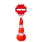 Çift reflektifli trafik konisi üzerine kolaylıkla montajlanabilen, 28 cm yuvarlak levha üzerine müşterilerin isteğine göre çift taraflı veya tek taraflı baskı yapılır. Koni yüksekliği 75 cm ve levha yüksekliği 28 cm dir. Toplamda setimizin uzunluğu 103 cm’dir. Toplam ağırlığı 2 kg gelmektedir.