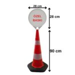 Çift reflektifli trafik konisi üzerine kolaylıkla montajlanabilen, yuvarlak levha üzerine müşterilerin isteğine göre çift taraflı veya tek taraflı baskı yapılır. Koni yüksekliği 90 cm ve levha yüksekliği 28 cm dir. Toplamda setimizin uzunluğu 118 cm’dir. Toplam ağırlığı 6 kg gelmektedir.